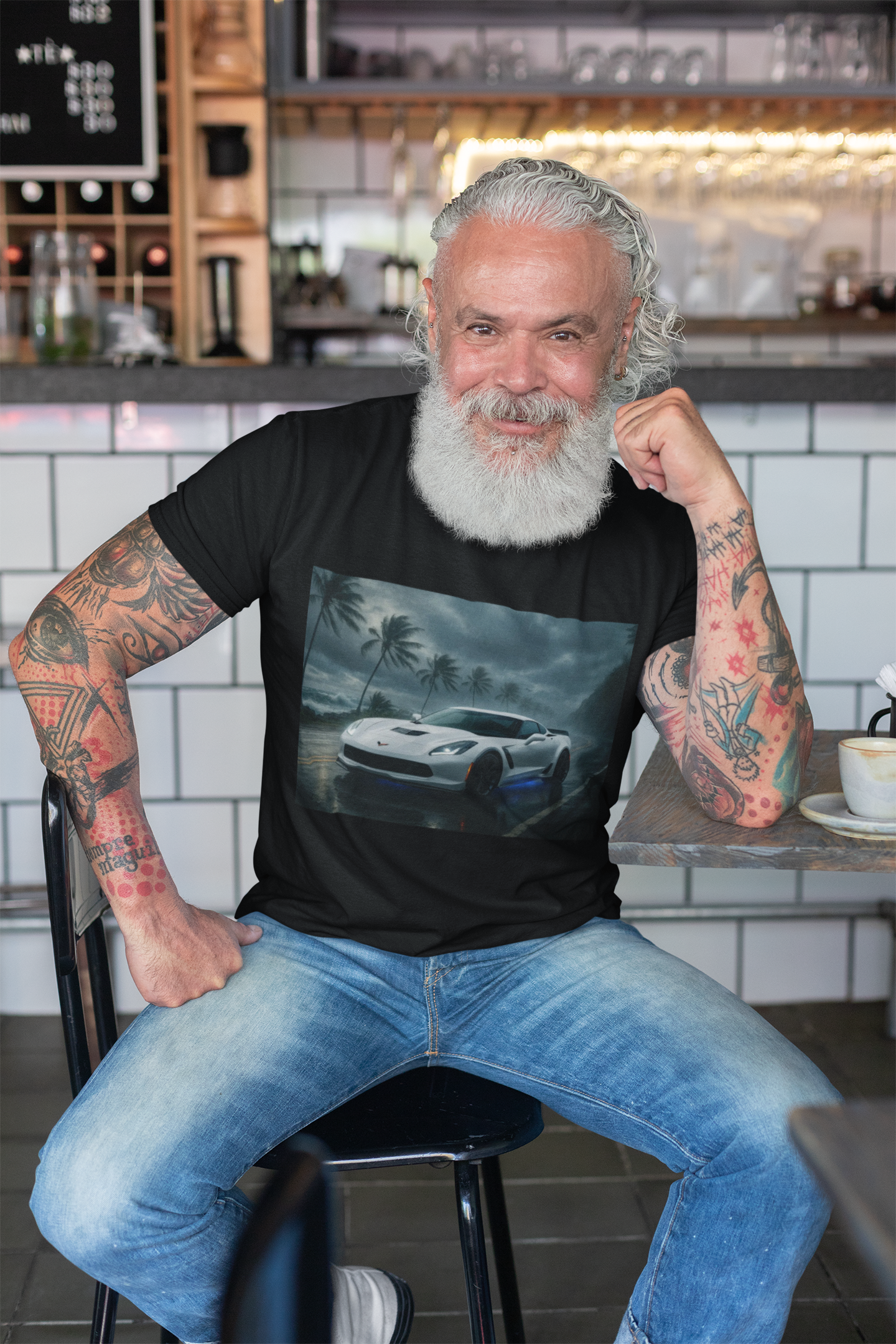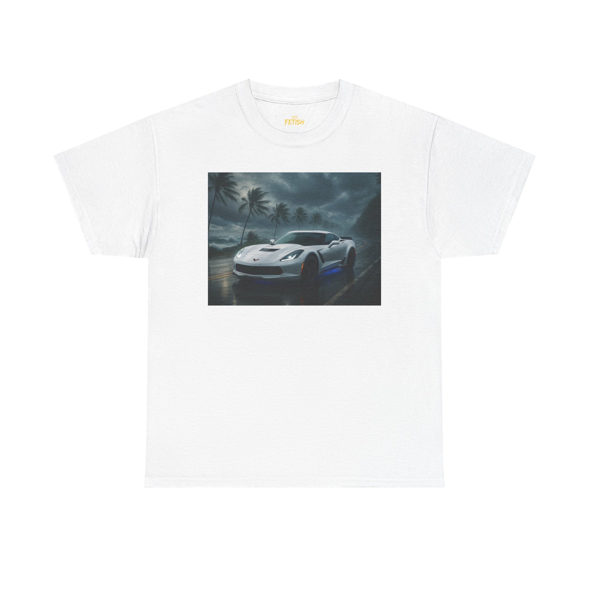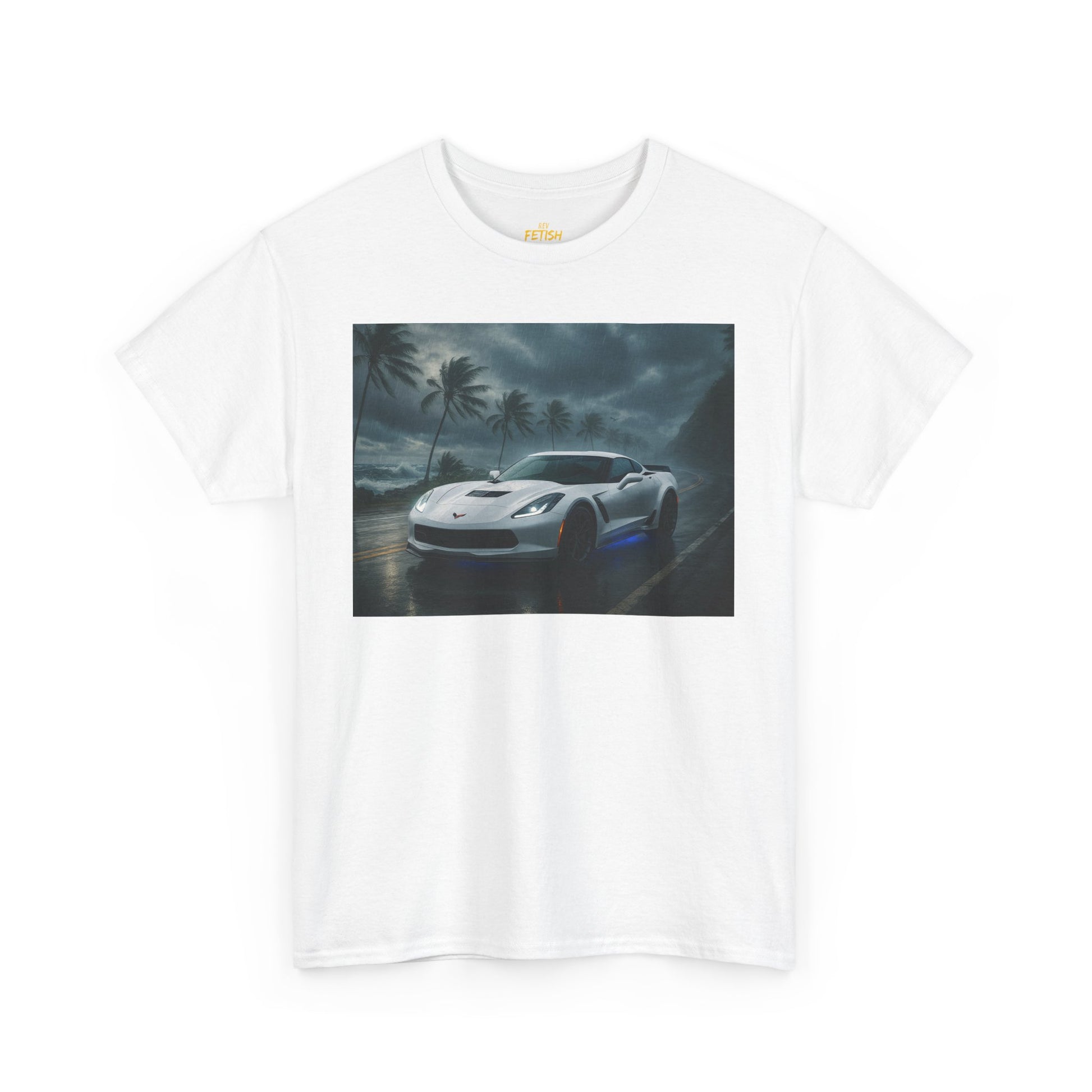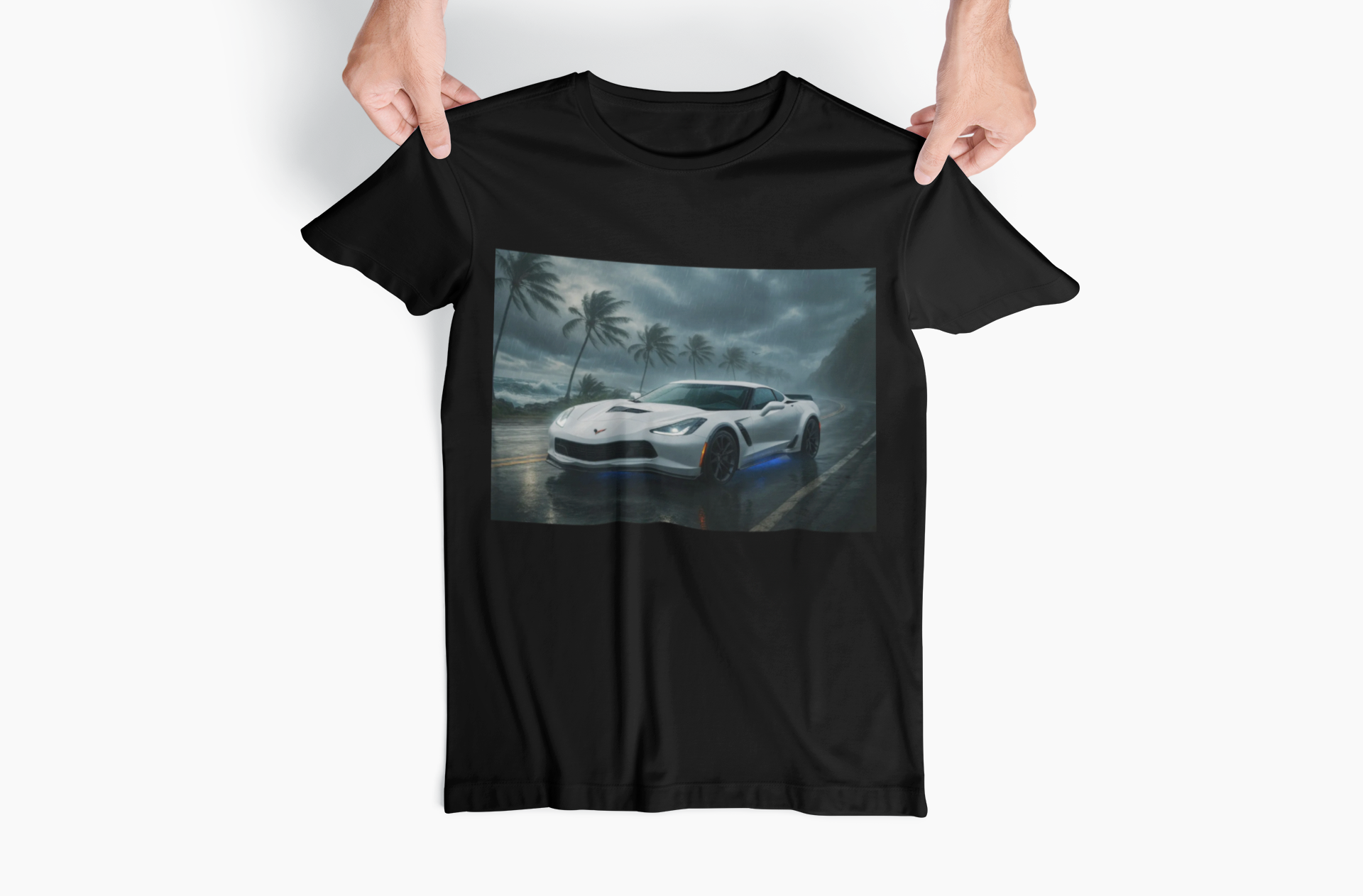 Unleash the raw power of American muscle with this striking Corvette Stingray Z06 design. Set against a stormy coastal road with swaying palms and crashing waves, the iconic Z06 shines in pure white with a menacing blue underglow. This artwork captures speed, strength, and style in one unforgettable image. Perfect for car enthusiasts who live for the thrill of the drive, it’s more than just apparel—it’s a statement of passion and performance.