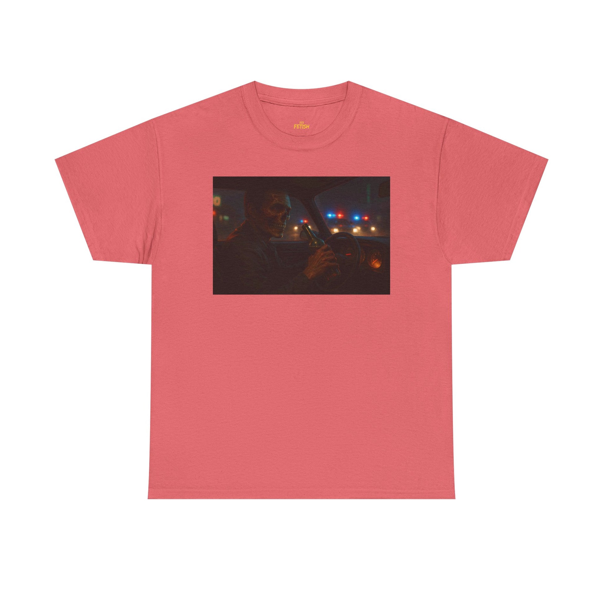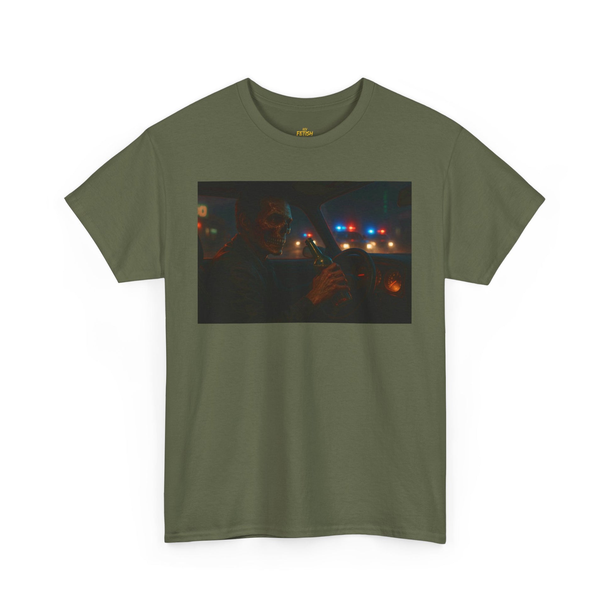 Defiance behind the wheel — this design captures the chilling image of a half-dead, half-skeleton outlaw tearing through the night in a muscle car. His decayed face and grinning skull are lit by the dashboard glow, one hand gripping the wheel while the other clutches a bottle. Police lights blaze in pursuit through the rear window, but his expression shows no fear — only rebellion. Product features - Shoulder tape for added stability and comfort. - Seamless design reduces waste and enhances aesthetics. - Ribbed collar maintains shape and elasticity. - Crafted from durable, high-quality cotton for long-lasting wear. - Tear-away label ensures comfort without irritation. Care instructions - Non-chlorine: bleach as needed - Do not iron - Do not dryclean - Machine wash: cold (max 30C or 90F) - Tumble dry: low heat
